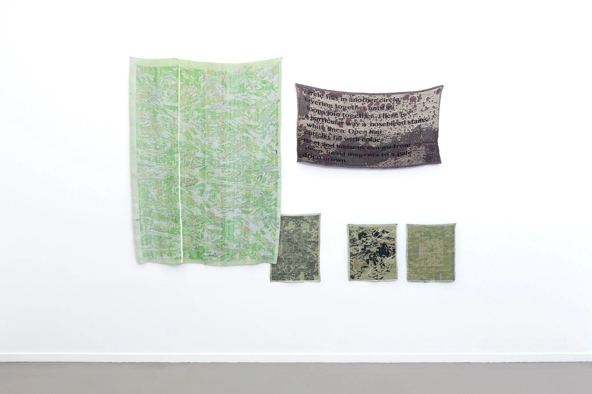 Arching, floating vision and alum & Parallel circles shine, through the grasp, in my eyes, installation of digital jacquard tapestries with embroidery, dimensions variable, 2019
