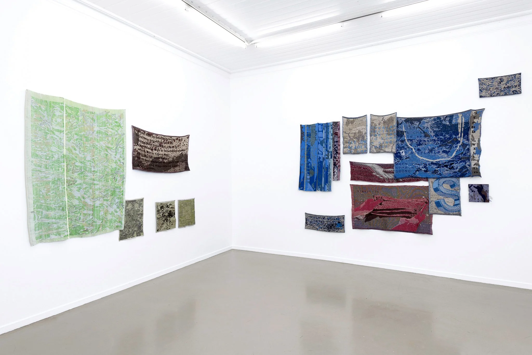Wood speaks about her tapestries as a collaboration between herself and the (weaving) machine, and shifts focus between materiality and expressivity. Changes of thread patterns can be observed in the works, as well as research on optical color-mixing as the proximity of threads creates new color-tones. At Akershus Kunstsenter, Wood is experimenting with a new type of installation: the tapestries overlap and multiply hyperlinking between them, imitating panel-windows opening on a computer screen.