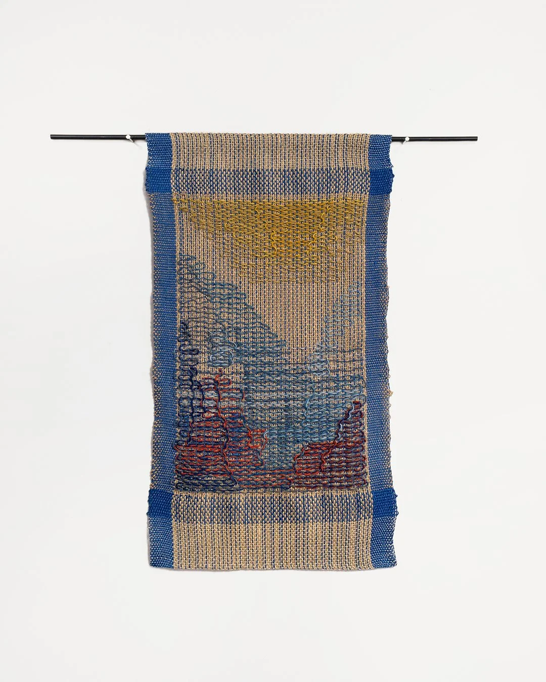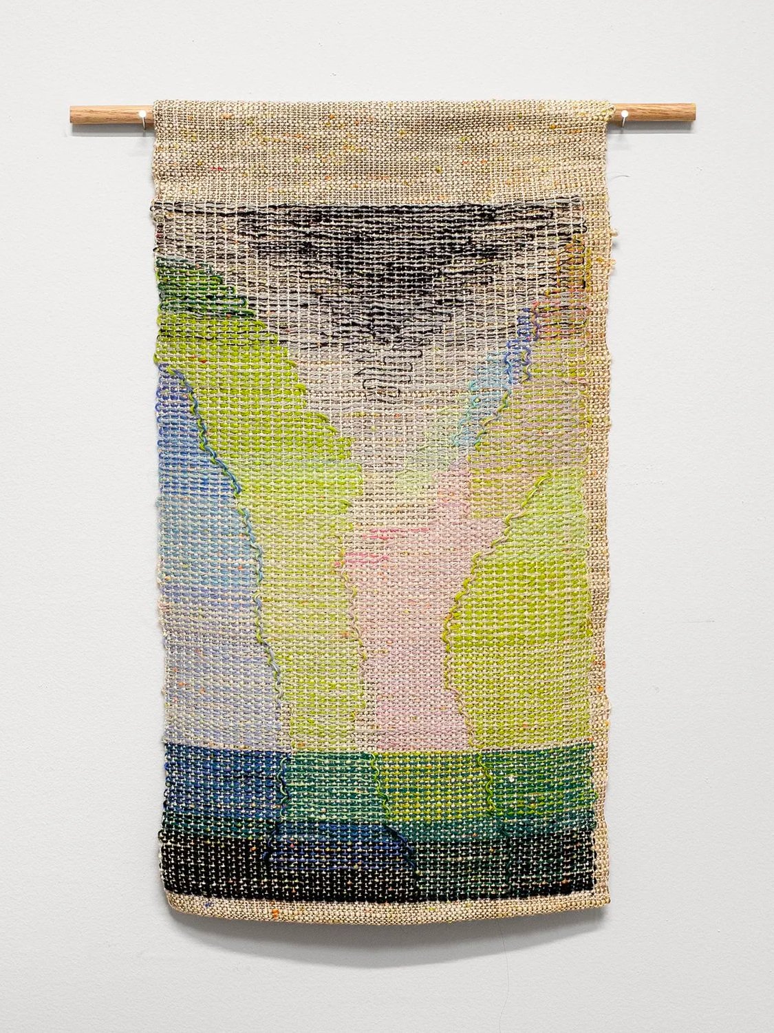 Atmospherics, handwoven tapestry in various reclaimed fibers, 16 x 11”, 2022,