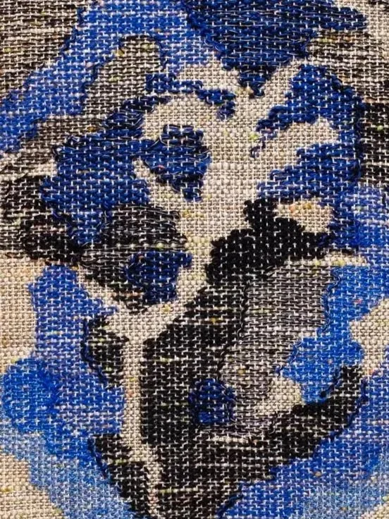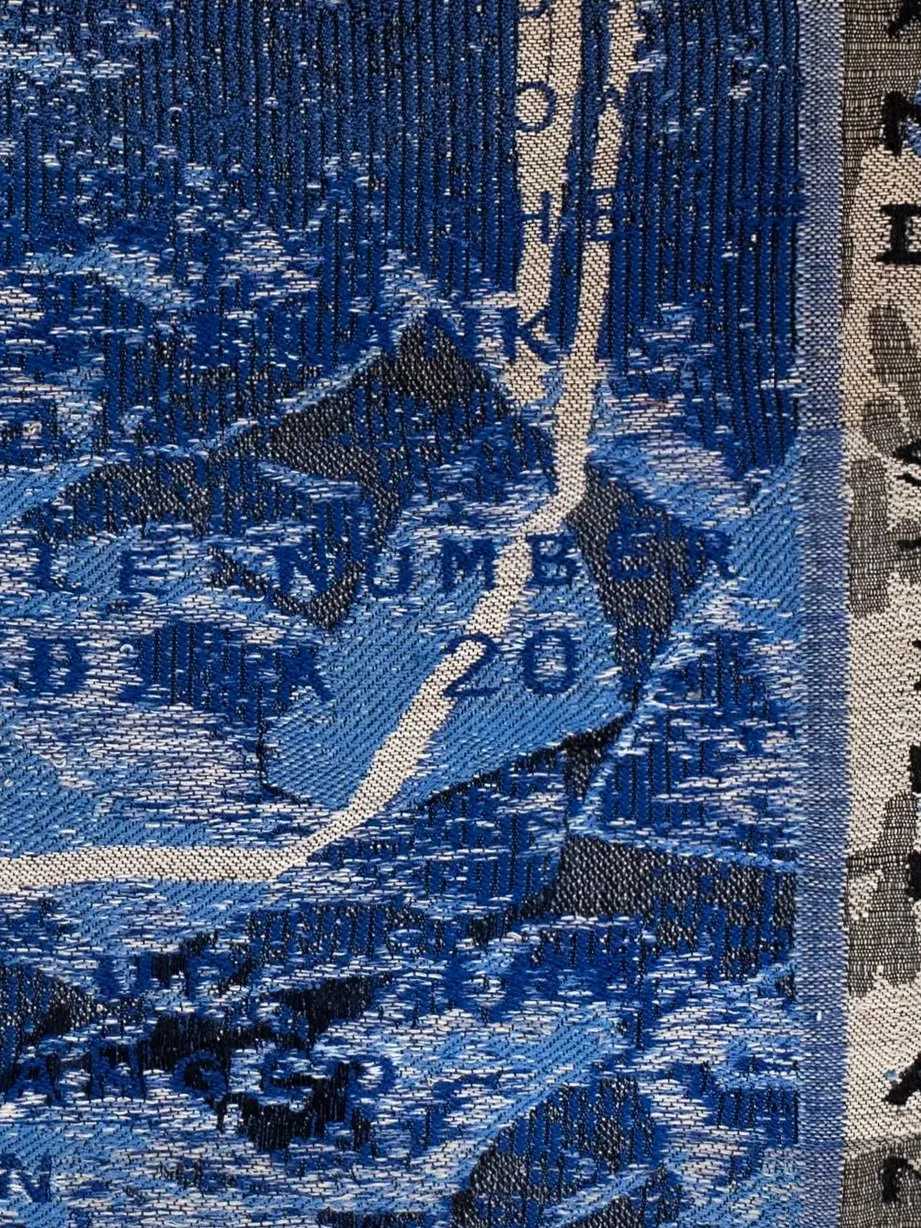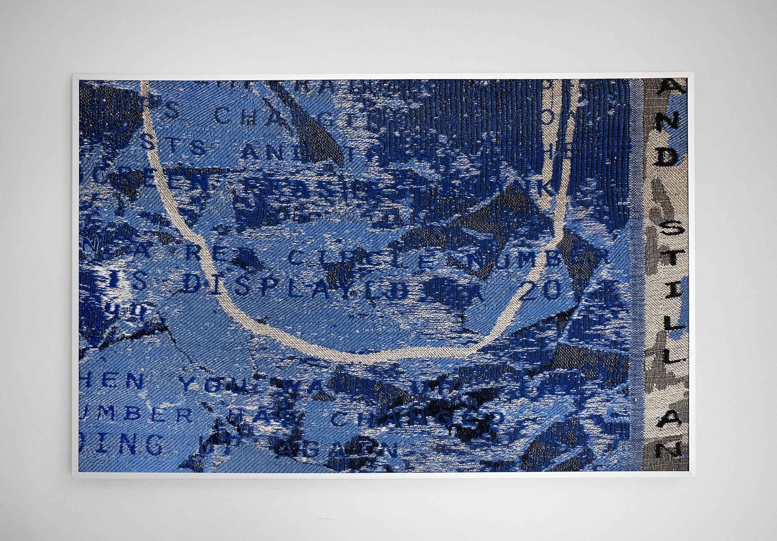 Blue Ice, handwoven digital jacquard tapestry in cotton and wool with embroidery, 25.5 x 36.5”, 2019