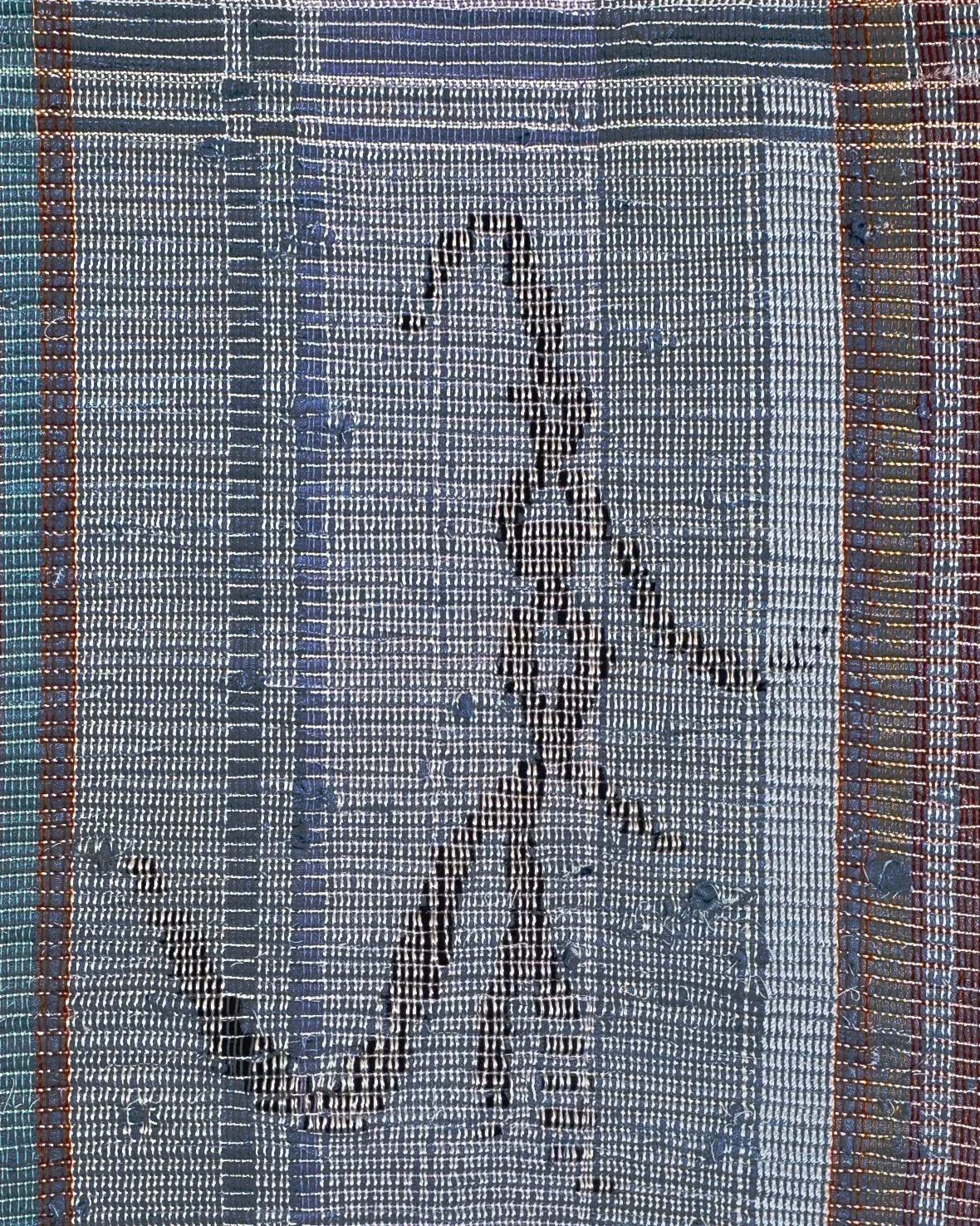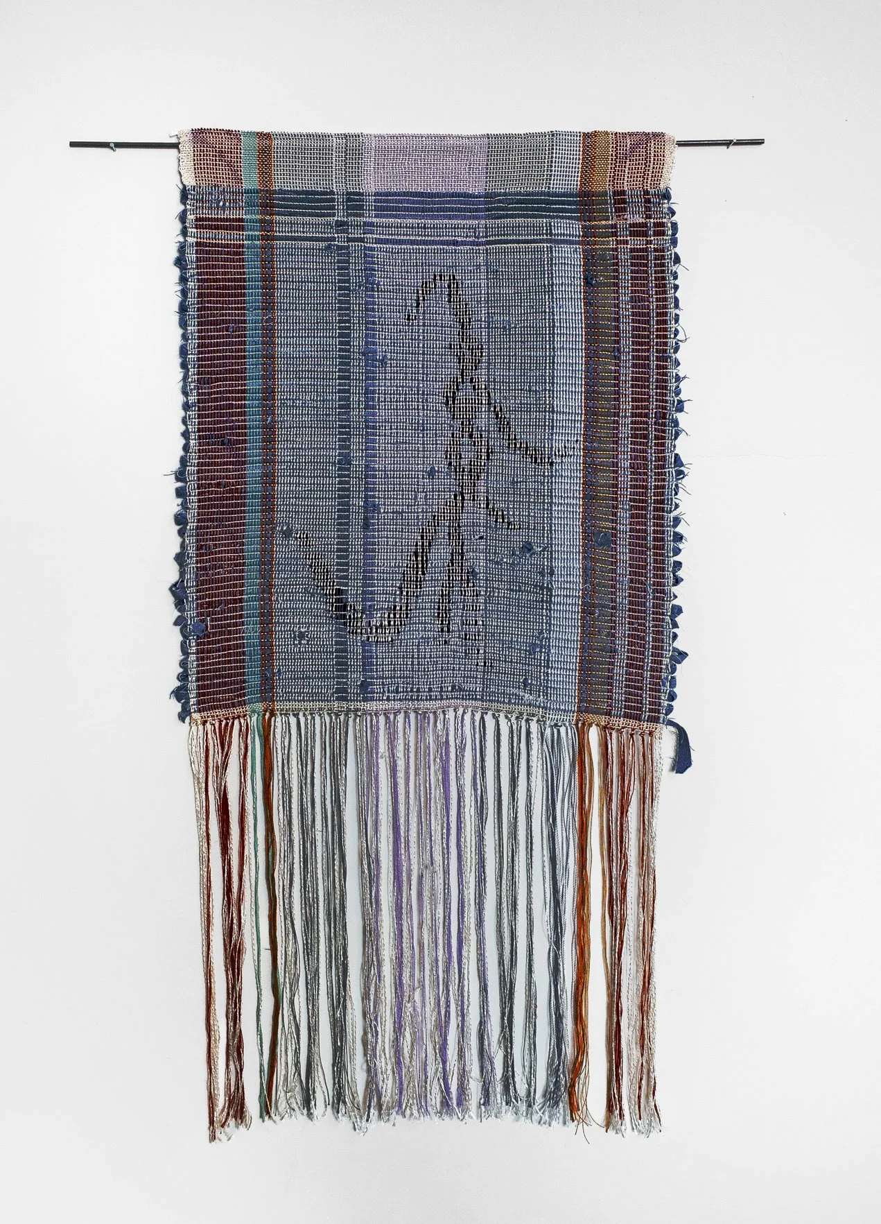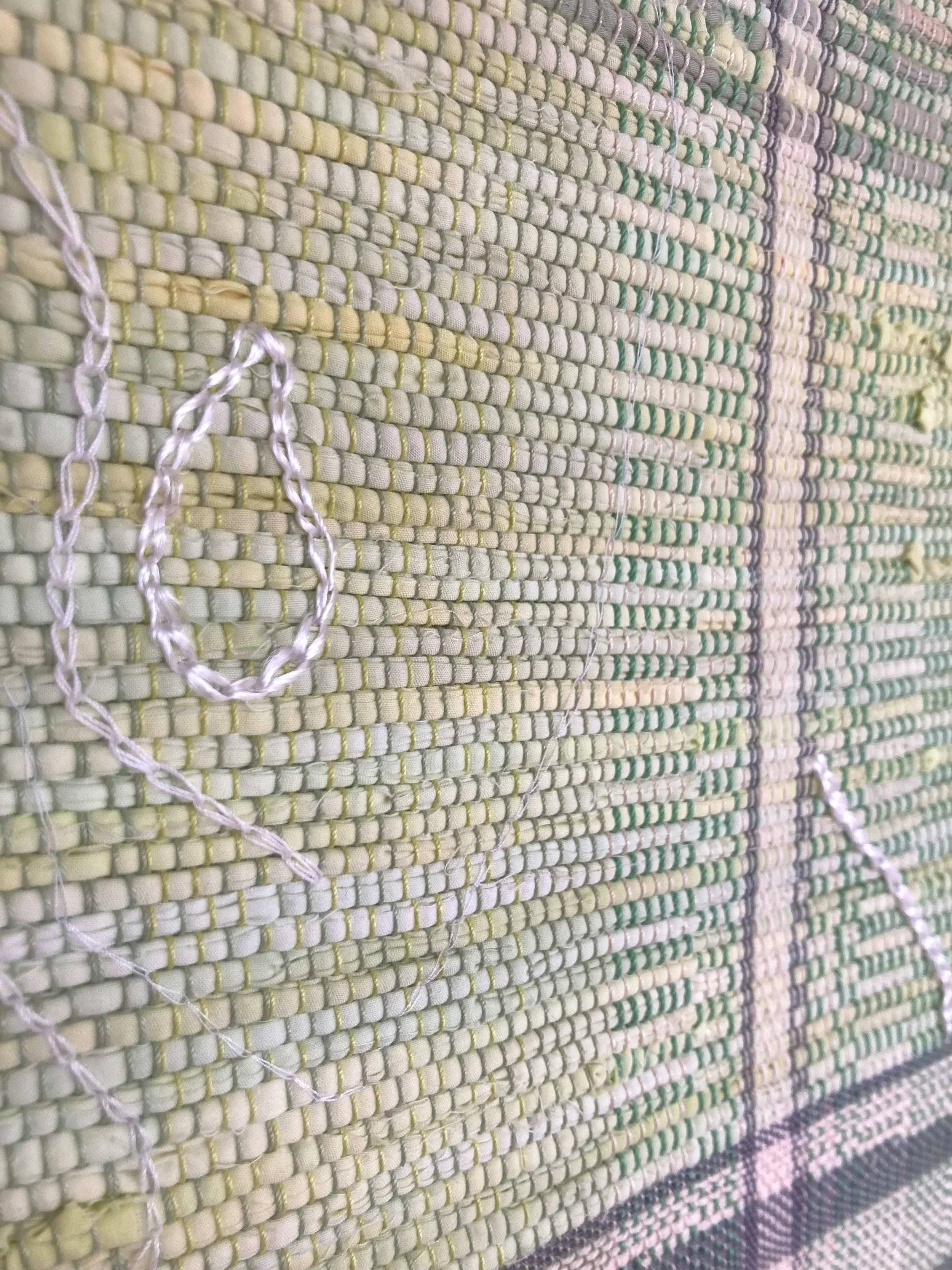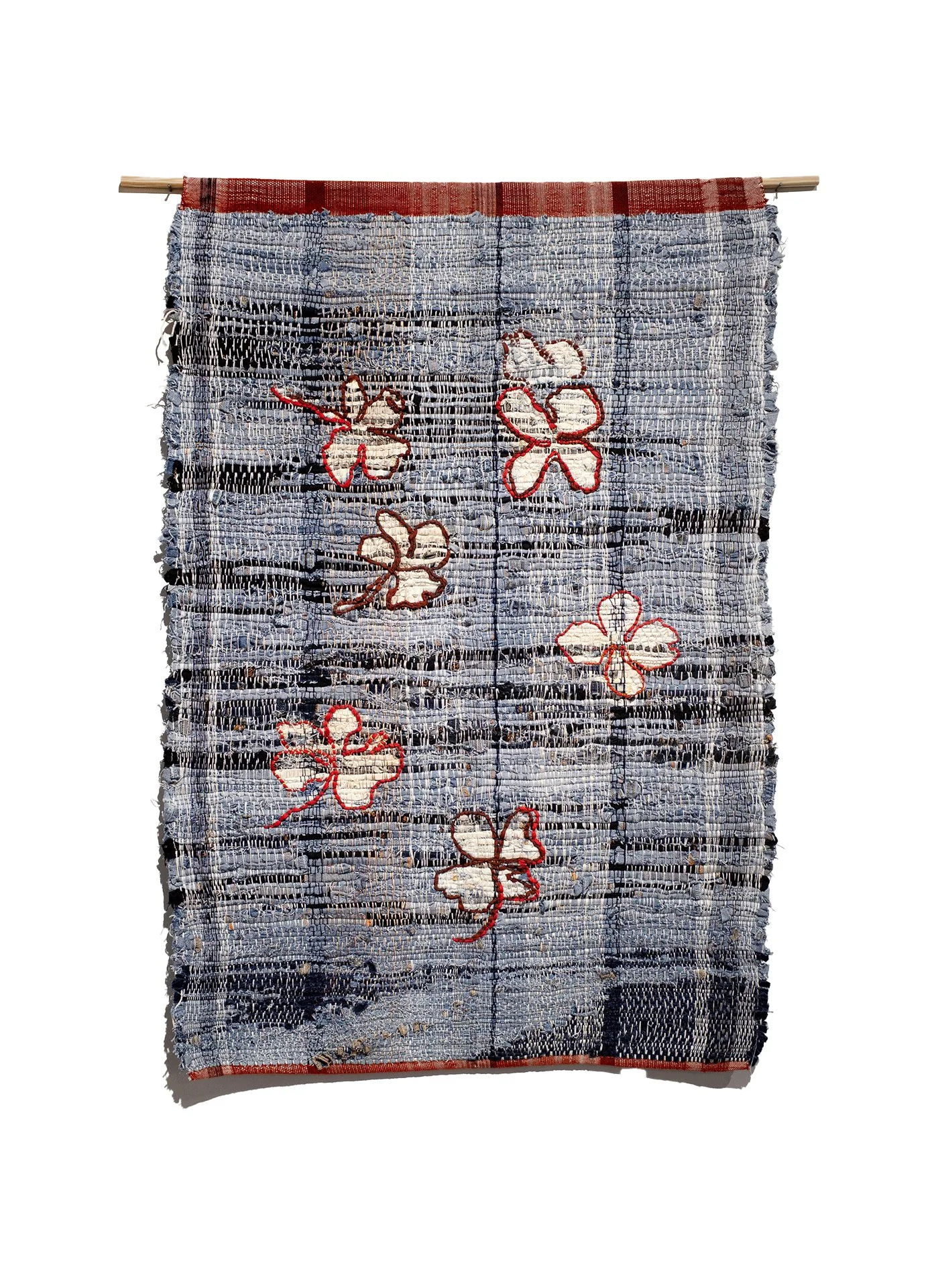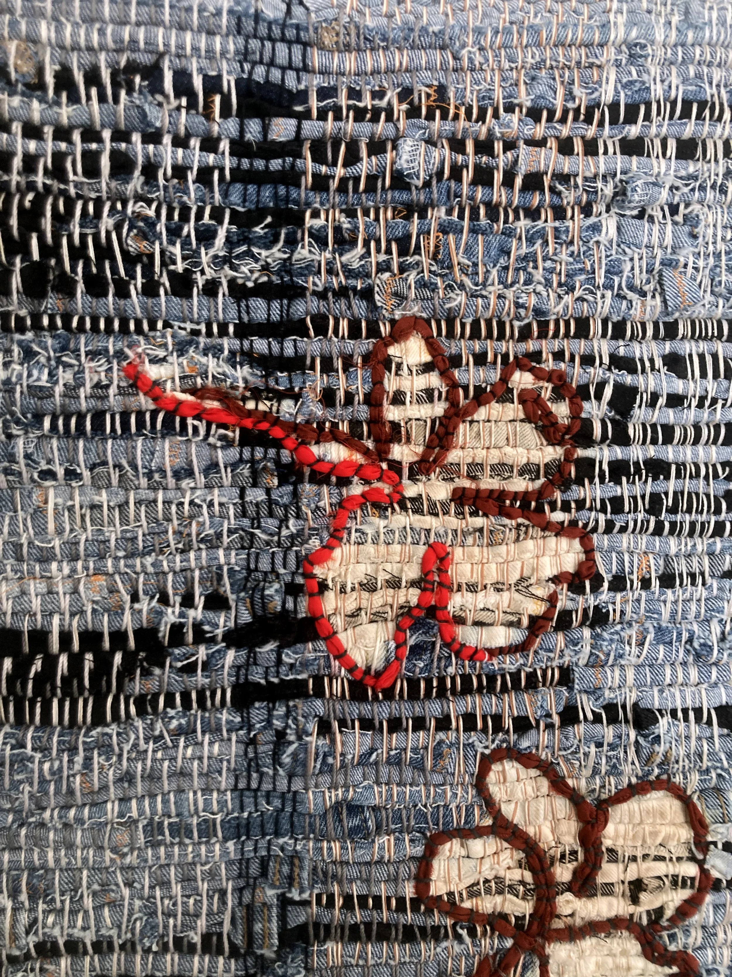 Clover (to have and to bring), reclaimed and bleached denim weft with various fiber warp and cotton ribbon embroidery, 29 x 44”, 2023