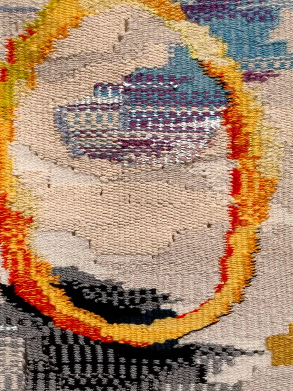 Ring, handwoven frame loom tapestry in mixed fiber, 20 x 13.5”, 2022
