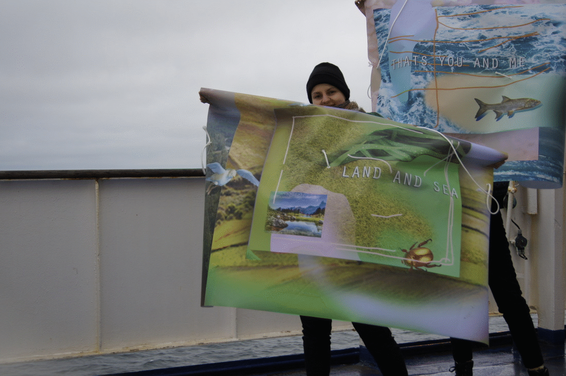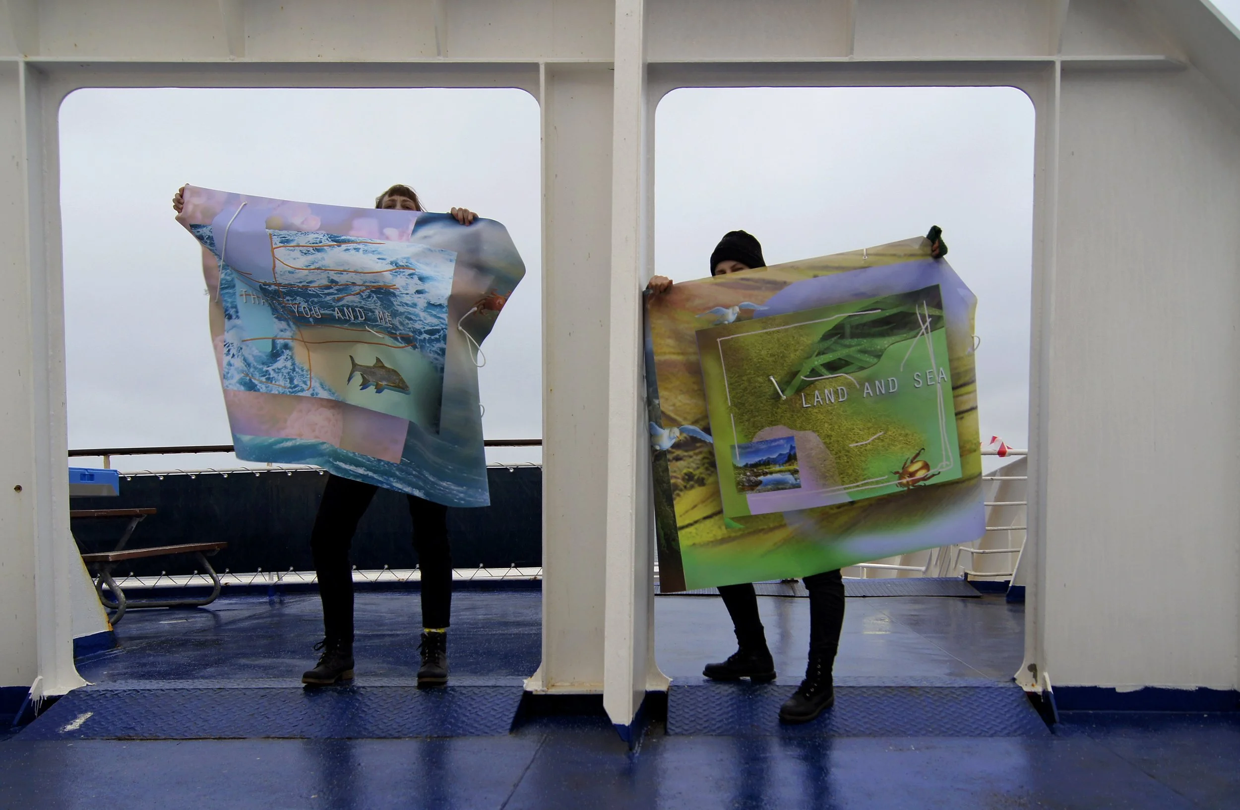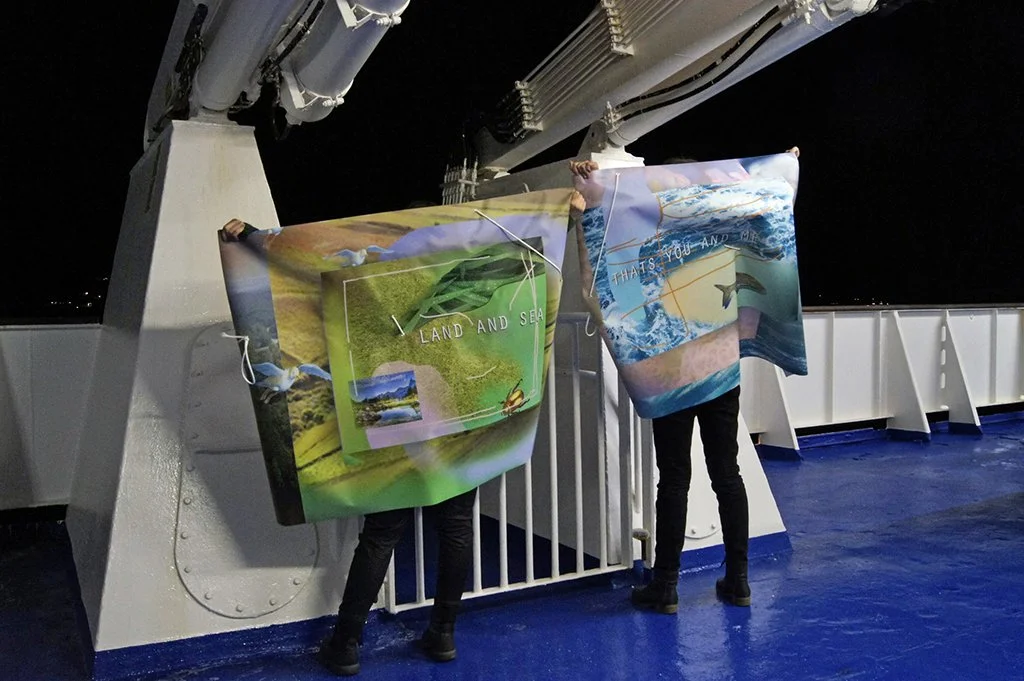 Wood and Paccula were wrapped in printed vinyl flags; the layered imagery depicting fields of wheat and forests as well as ocean waves, the respective flora and fauna of both human animals and sea creatures. The flags were brandished as banners, similar to Greenpeace's protests of the 1990s as well as used as windbreaks and temporary shelters from the Nordic sleet.