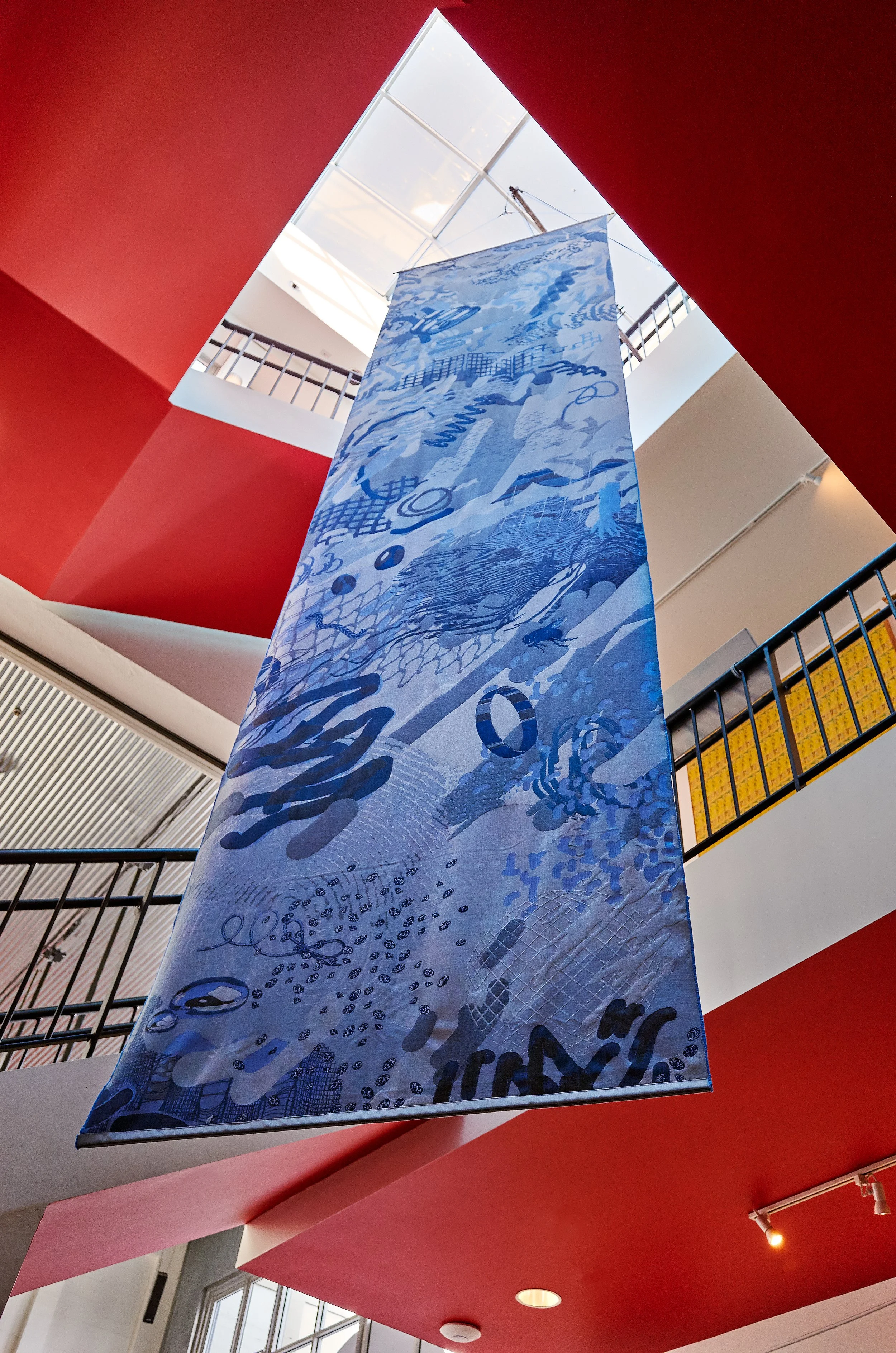 Semi Set Vertical Blue, digital jacquard tapestry in cotton and wool blend, 6m x 2m x 1mm, 2017