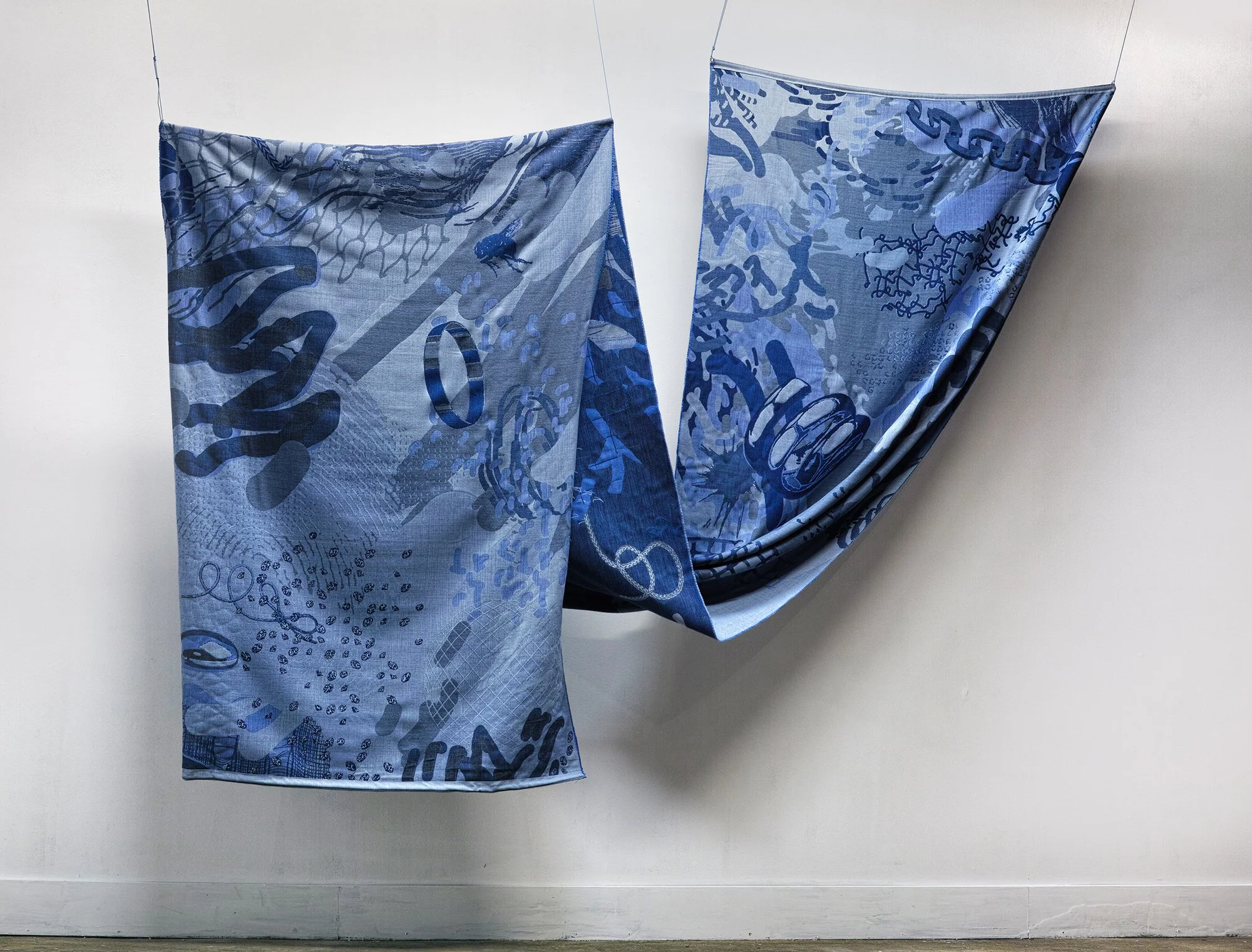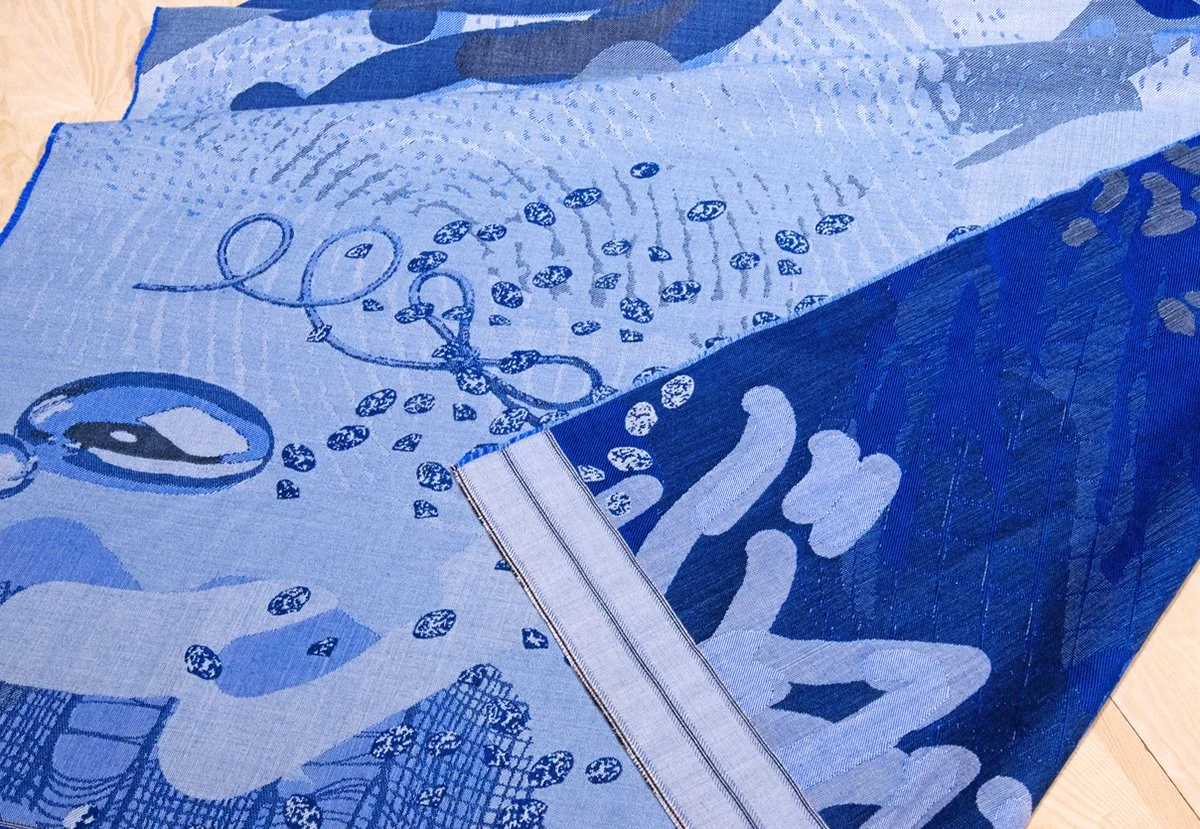Semi Set Vertical Blue is a six-meter long tapestry inspired by the infinite capacity of the internet. Like building a website, weaving a tapestry allows the designer freedom to continue an image or idea beyond the limits of a page.