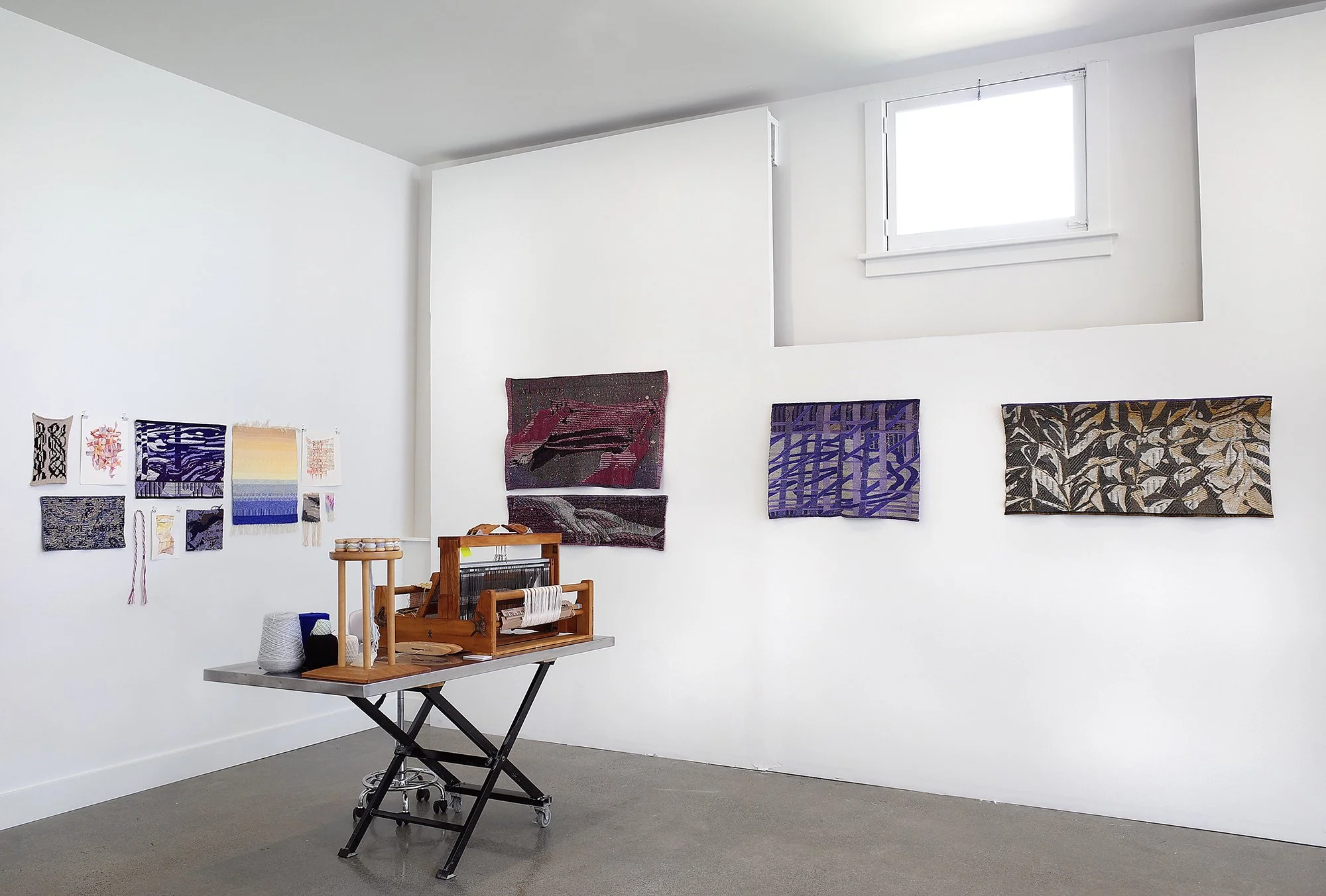 Corner installation view with studio set-up, which includes a marudai and four-shaft table loom
