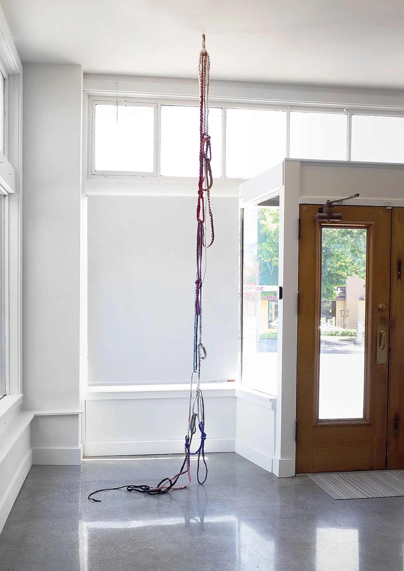 kumihimo braid woven in cotton, wool, nylon, and acrylic fiber, 900 x 3 x 1”, 2022